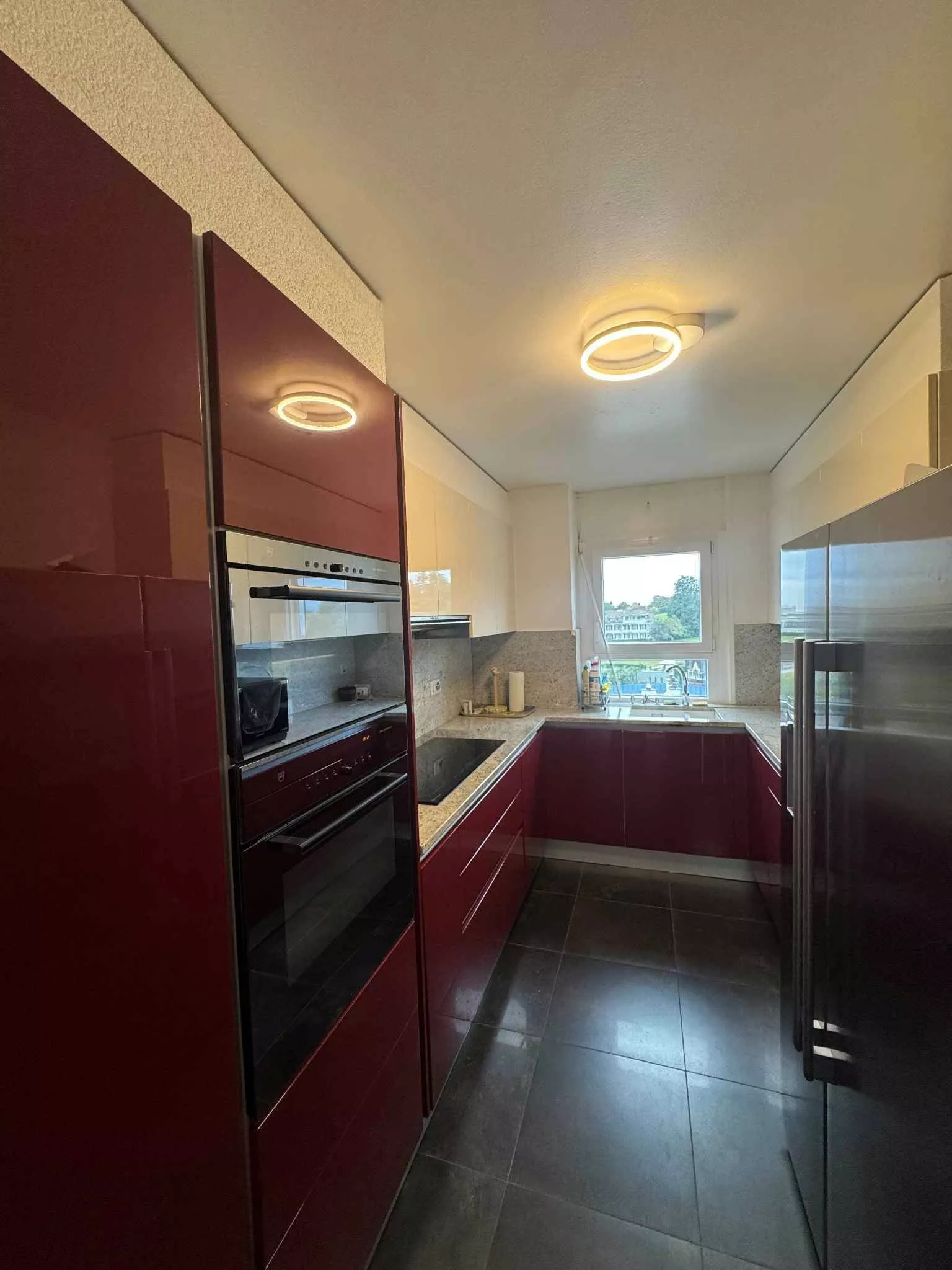 – Cuisine moderne équipée : Avec placards rouges élégants, plan de travail en granit, four et micro-ondes encastrés, réfrigérateur américain et lave-vaisselle