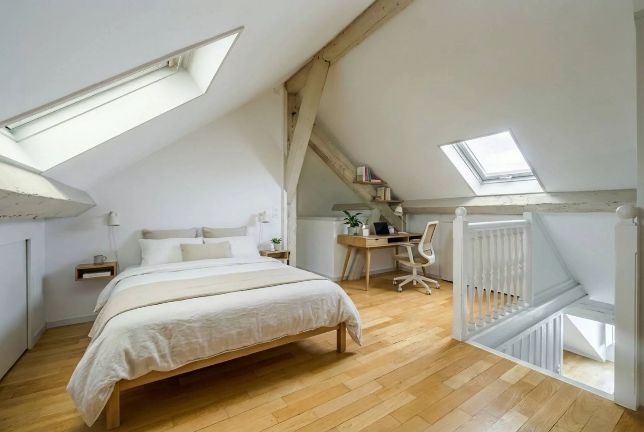 A l’étage, une chambre à coucher avec salle de douche, un espace bureau ouvert sur le séjour, un toilette séparé et une chambrette bénéficiant d’une belle vue sous comble avec accès indépendant complète cette espace