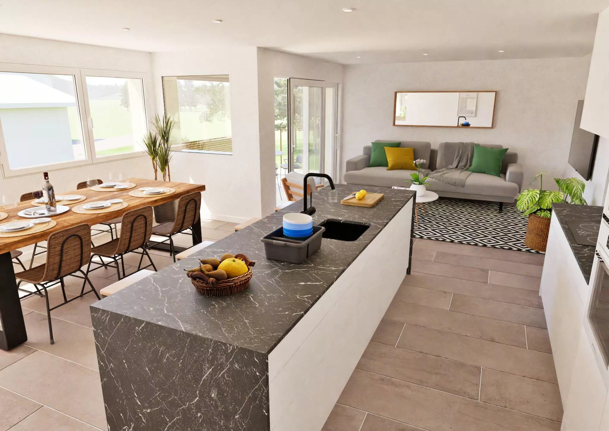 – une cuisine entièrement agencée, avec îlot central, ouverte sur le coin à manger et le séjour