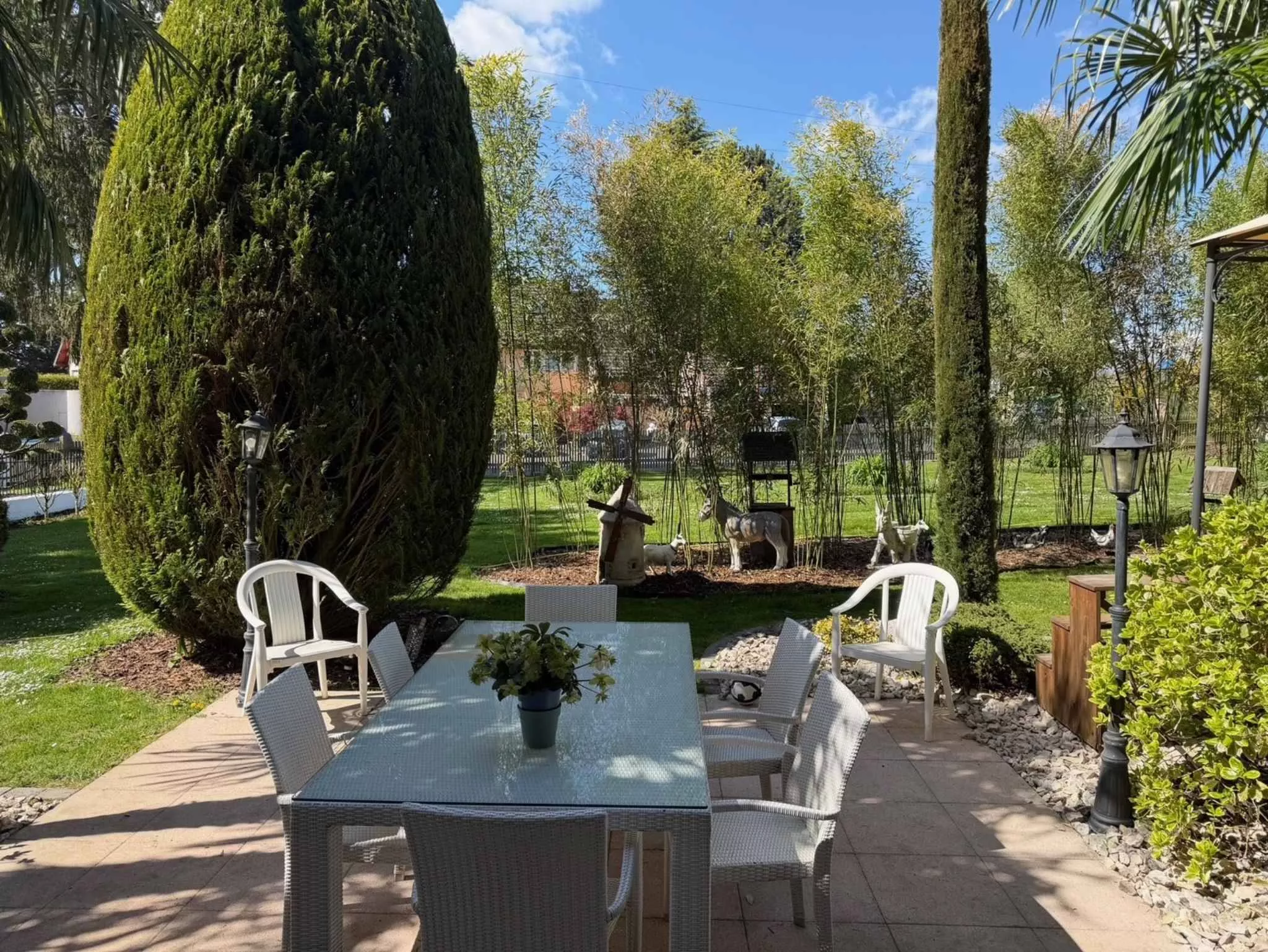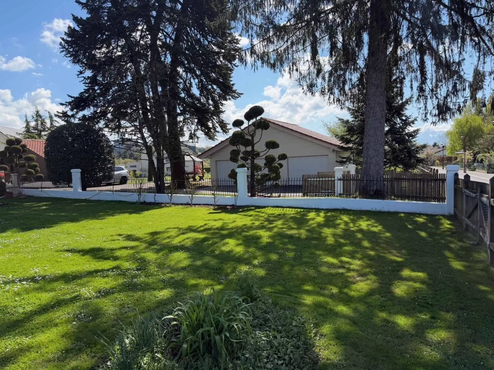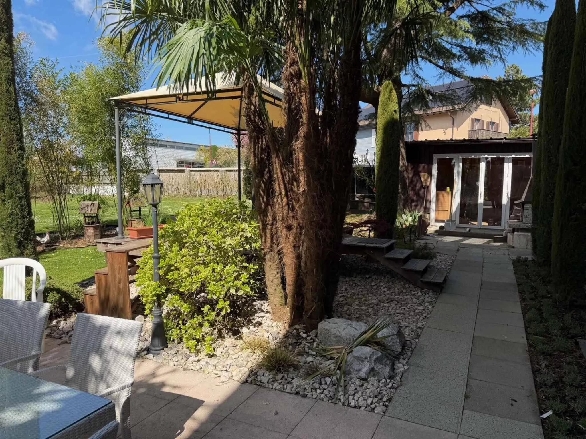 A l’extérieur, on retrouve une belle terrasse dallée, un grand jardin verdoyant ainsi qu’un abri de jardin avec jacuzzi.